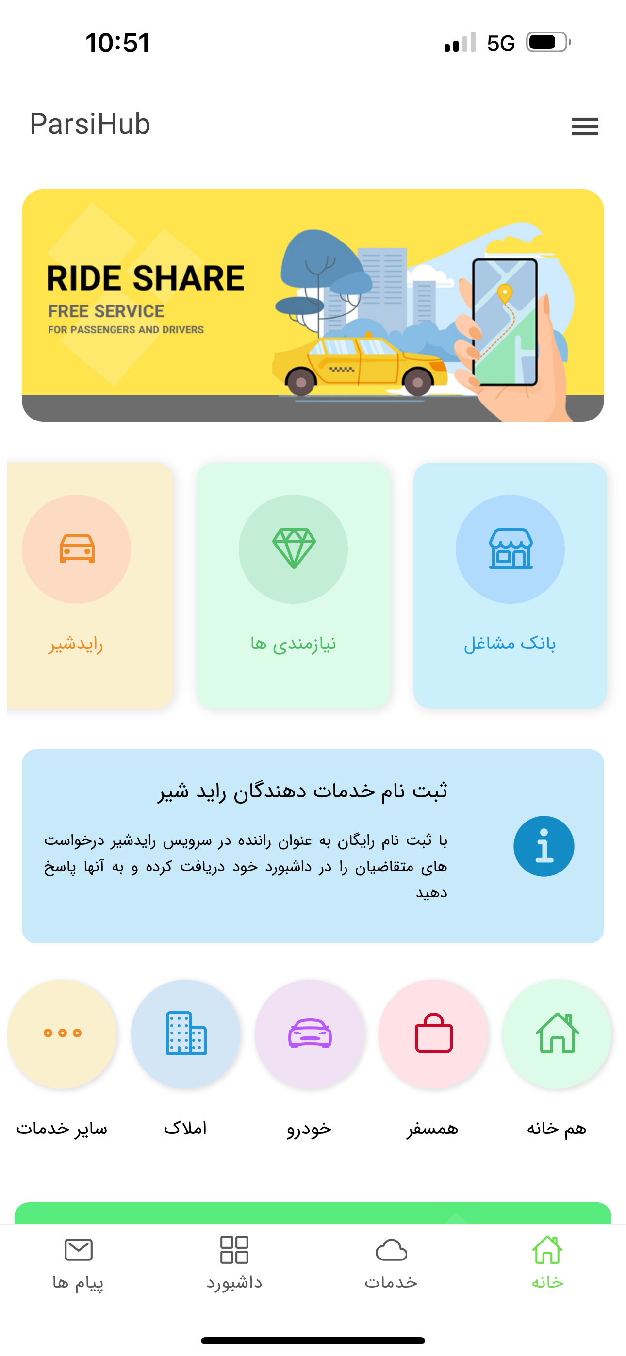 این سرویس ها شامل: سرویس راید شیر٬ ارسال بار مسافر٬ جستجوی همسفر٬ جستجوی هم خانه٬ سرویس کاریابی٬ خرید و فروش خودرو٬ مسکن و املاک٬ معرفی رویدادها با امکان خرید آنلاین بلیط٬ نرخ روز ارز در صرافی ها٬ معرفی تور های مسافرتی٬ نیازمندی ها٬ بانک مشاغل با امکان معرفی محصولات و خدمات و همچنین امکان فروش آنلاین محصولات و سرویس نوبت دهی آنلاین برای کسب و کارهای خدماتی می باشد